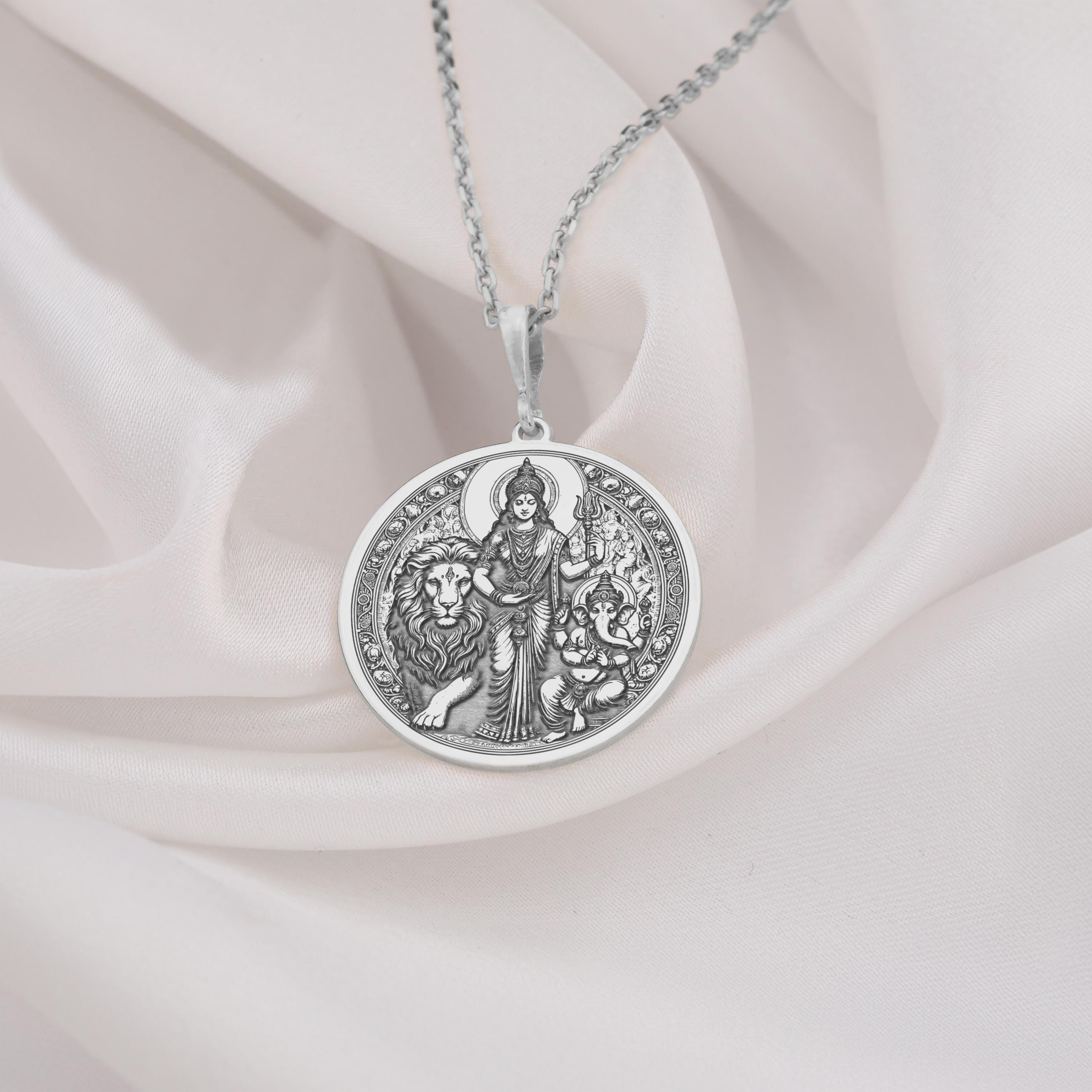 Parvati Ganesha and Lion Pendant necklace, available in 14k Solid gold, 925 sterling silver, 14K Gold Plated, 14K Rose gold plating. Parvati the goddess of power and love, alongside Ganesha, the remover of obstacles, with a majestic lion symbolizing courage. Crafted as a meaningful medallion, it’s perfect for both men and women who seek spiritual guidance and protection. Wear this unique piece to embody the nurturing and powerful energies of Parvati and Ganesha in your daily life.