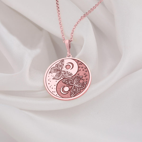 Butterfly Yin Yang Medallion Pendant is available in 14K Solid Gold, 925 Sterling Silver, 14K Gold Plated and Rose Gold Plated A perfect gift for spiritual seekers, meditation enthusiasts, and those drawn to symbols of personal evolution, this intricate coin pendant brings peaceful energy, balanced perspective, and transformational guidance. Ideal for spiritual milestones, mindfulness ceremonies, or meaningful celebrations of life's continuous changes.