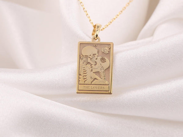 14K Solid Gold The Lovers Tarot Necklace, Romantic Skeleton Necklace, Romantic Halloween Gift, Halloween gift necklace, Gothic jewelry Gift