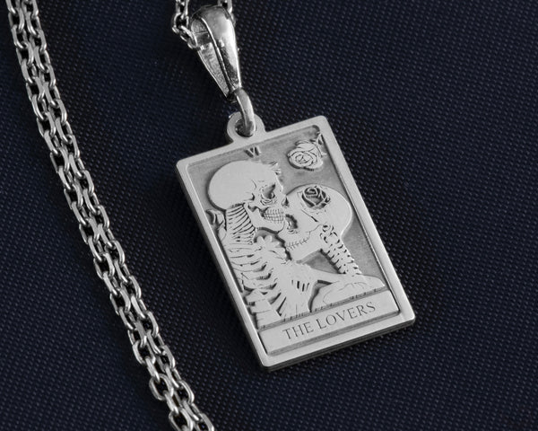 "The Lovers" Tarot Skeleton Necklace πβ€οΈ symbolizes eternal love with two intertwined skeletons. Inspired by the Lovers tarot card π, it's perfect for gothic fashion lovers π€ or as a unique gift π for Halloween π, weddings π, or anniversaries. Crafted from silver-plated brass with an adjustable chain π